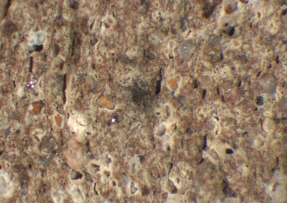 pink, irregular, riddled with fine to large white inclusions, some large dark brown particles, sporadic very large reddish brown inclusions |