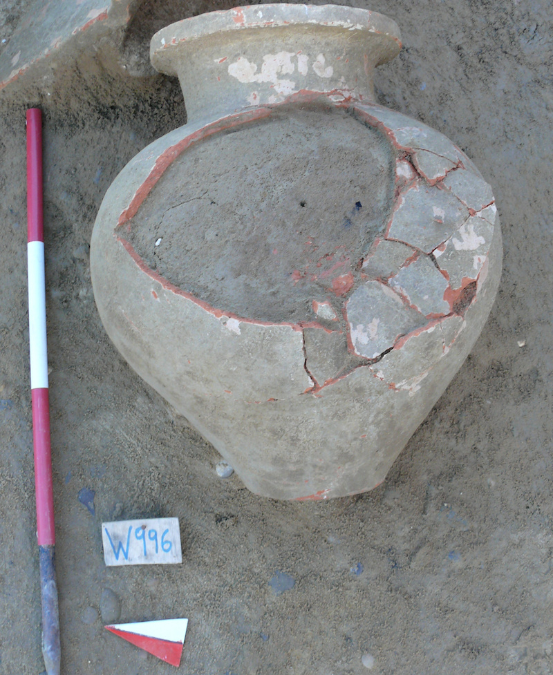 reddish yellow, irregular; some large to very large yellowish white inclusions, some mid-sized dark particles |