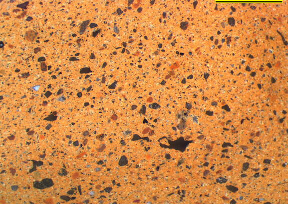 reddish yellow; granular; some fine dark inclusions, few fine to medium-sized white particles |