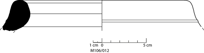 colour grey, edges red, texture fine and compact, few medium sized inclusions: white, grey, red, voids, mica |