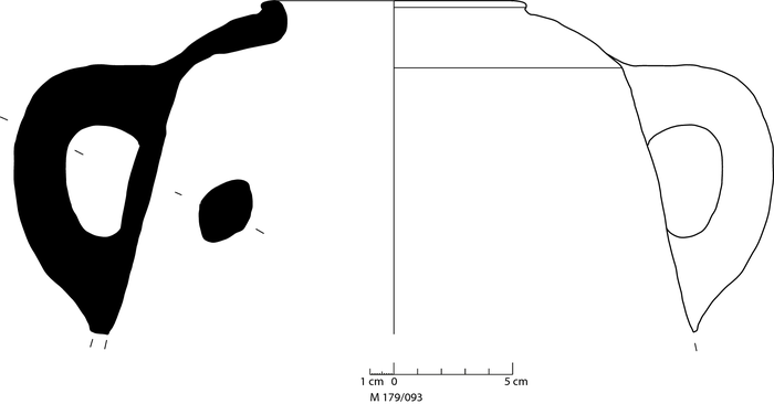 colour light red, core light brown, texture middle fine, numerous small to large inclusions: white, grey, red, mica, voids |