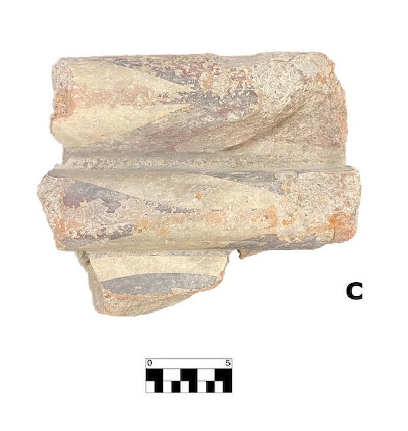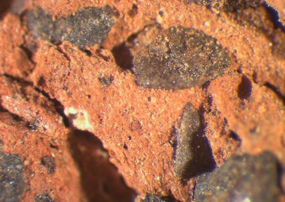 Compact clay of pinkish-orange colour, with visible inclusions of big and medium size of black and grey colour and smaller particles of white-yellowish colour. |