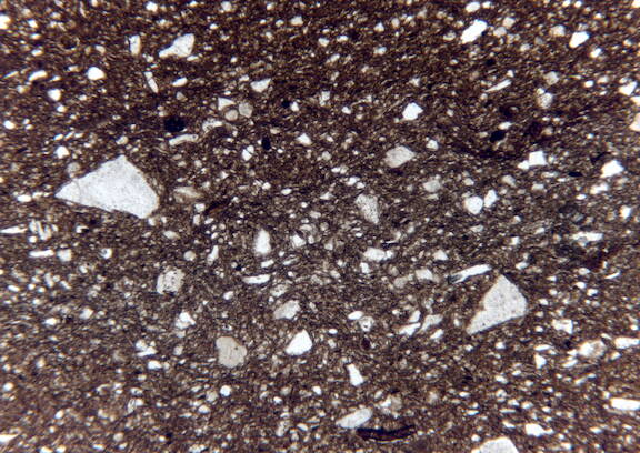 reddish yellow, fine; many fine to mid-sized white, red and dark inclusions |