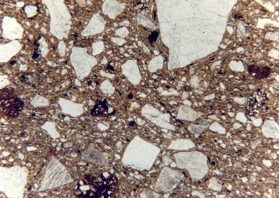 yellowish red, irregular; many medium-sized to very large white inclusions, sporadic large to very large reddisch brown particles |